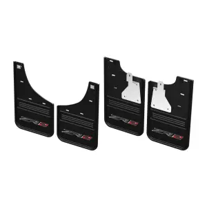 Help protect your vehicle from mud, gravel and road splash with a Front and Rear Rubber No-Drill Gatorback Mud Flap Kit with Black Chevrolet Bowtie Logo from Chevrolet Accessories. Constructed of 1/2-inch-thick heavy-duty virgin rubber designed to stand up to road debris and shed water with ease, these no-drill custom mud flaps feature a die-stamped anodized aluminum plate that provides integrity while offering a custom look with a ZR2 logo. Kit includes front and rear mud flaps, mounting hardware and installation instructions.